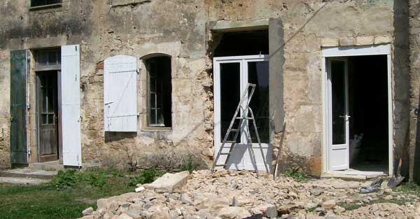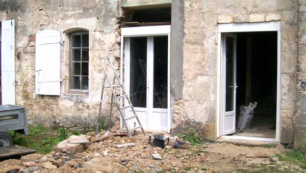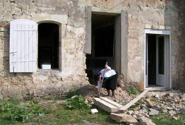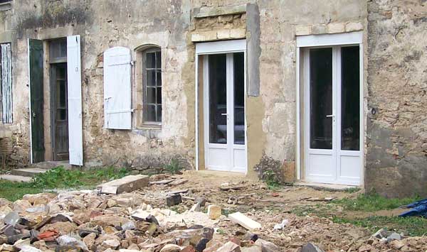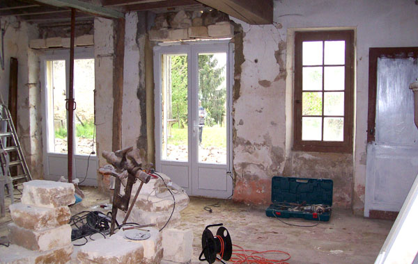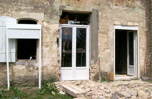 C’est ce jeudi matin que nous avons commencé la pose de la deuxième porte fenêtre. Pour l’occasion la jeune fille de la famille était venue donner un coup de main... c’est les vacances.