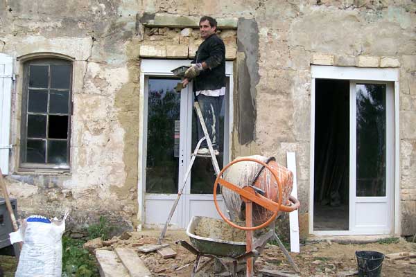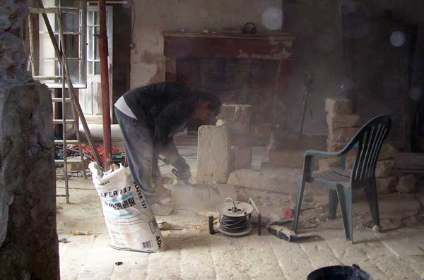 Vendredi 13, temps pas terrible, il faut couper les pierres qui vont être posées sur les IPN pour constituer le linteau de la porte fenêtre.