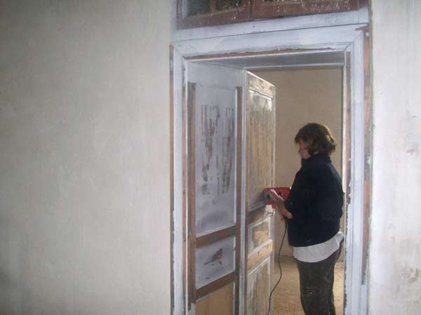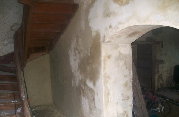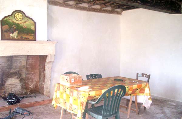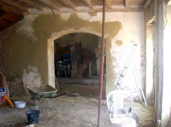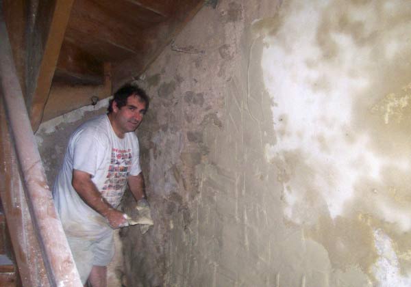 Moi-même en train d’enduire le mur à côté de la voûte... il y a du boulot :