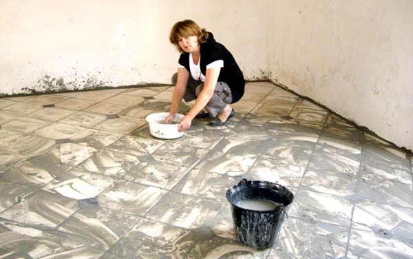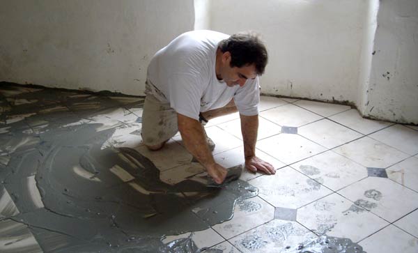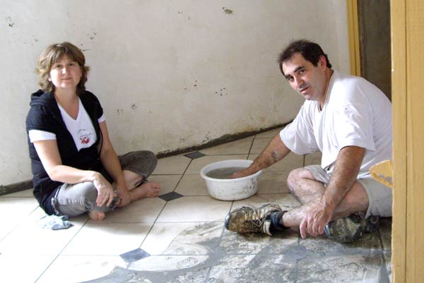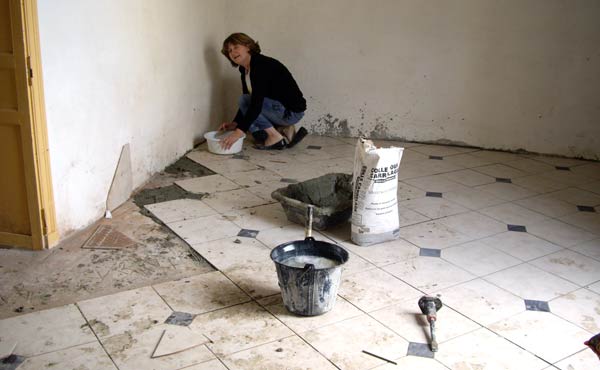Madame à défaut de jeter l’éponge, se contente de la passer, tandis que je continue la pose du carrelage et de ses nombreuses découpes...