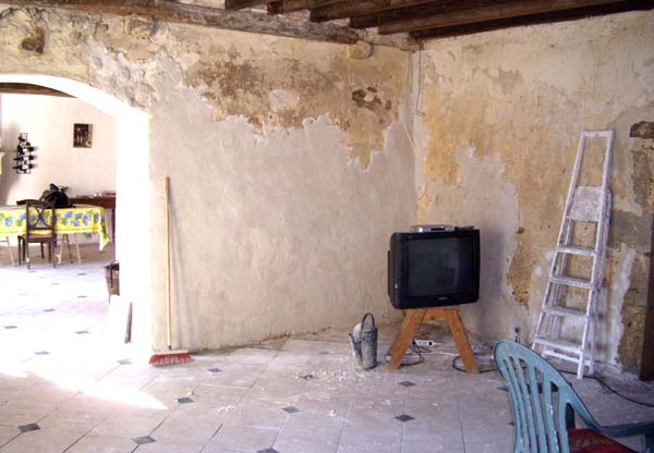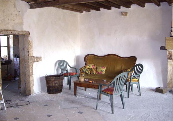 Le gros morceau en cours est le salon avec dans un premier temps le rebouchage de tous les trous. La semaine dernière, j’ai fait la face Nord et Est. Ce week-end, je me suis occupé de l’Ouest, mais il y a encore du rebouchage à effectuer et puis aussi il faut passer l’électricité, ce qui ralentit la cadence.