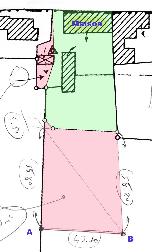 Et pour résumer un plan tiré du cadastre avec la partie verte qui correspond à ce que nous avions et la partie rosée qui correspond à ce que nous achetons.