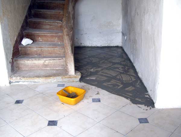 Tout d’abord, nous avons terminé les joints du carrelage et passé le badigeon dans une bonne partie de la cage d’escalier.