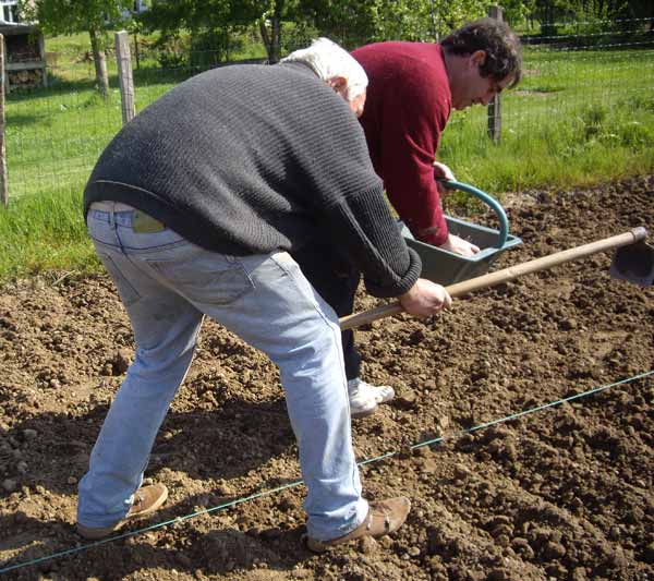 Nous avons planté quatre variétés de pommes de terre (Mona Lisa, Ratte, Bintje et Amandine). Cela devrait, d’après ce qu’il m’a dit, donner environ 500 kg... il va falloir appeler les copains pour la récolte.