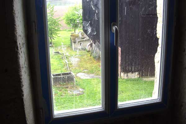 Là, les fenêtres viennent d’être posées. Avec le double vitrage, on n’entend plus les grenouilles qui s’en donnent à coeur joie dans le bassin en contrebas...