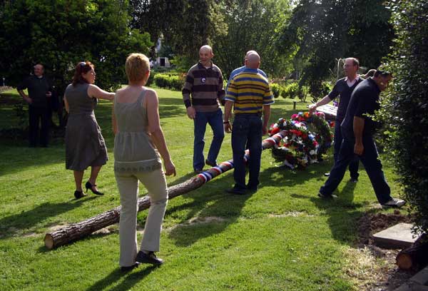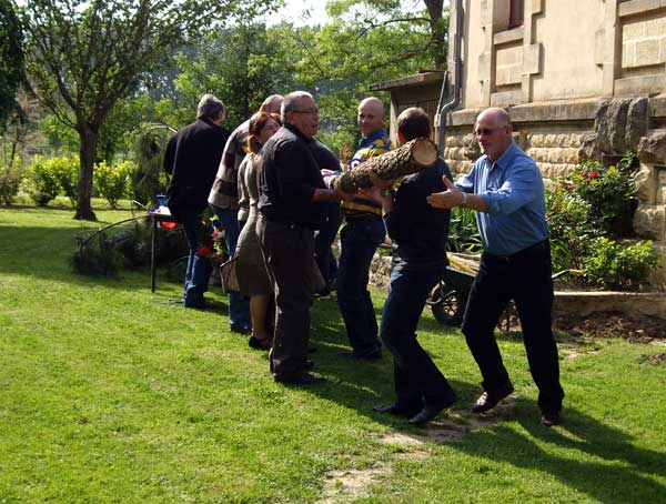 Ci-dessous, le relevage du pin avec l’équipe municipale au complet accompagnée par les frifres et le tambour.