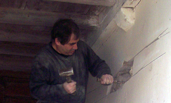 Nous avons également décidé de faire une très grande pièce en bas et d’ouvrir entre les deux parties de la maison. Nous allons donc placer deux IPN, là on est juste à la saignée qui va permettre de positionner le premier IPN. Le mur est large et porteur, ca va être du boulot.