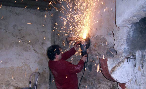 Ci-dessous encore et toujours des coups de meuleuse pour tronçonner tous les bouts de ferrailles qui étaient dans les murs.