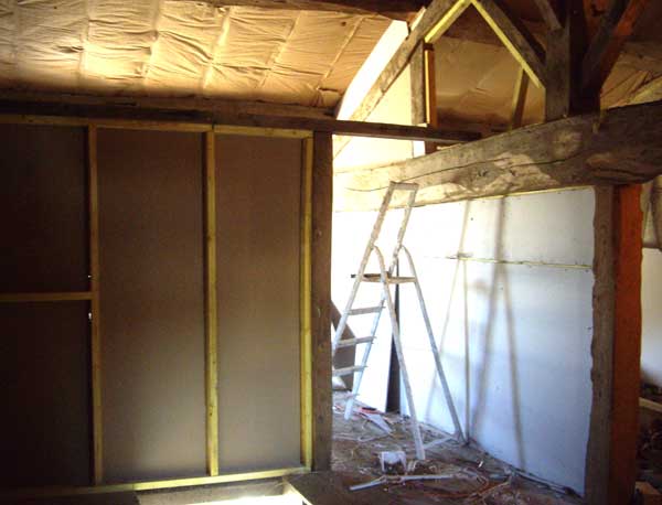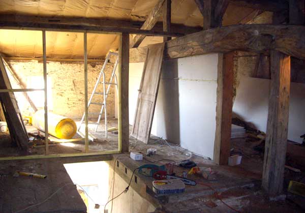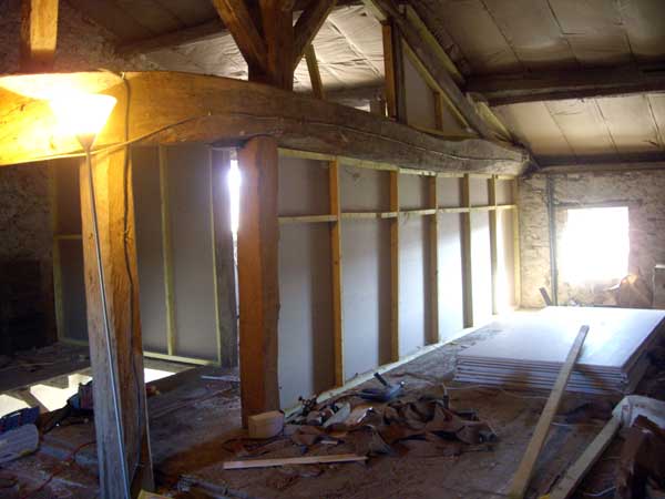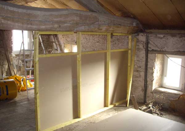 La vue de l’autre côté. J’attends avant de refermer d’avoir passé l’électricité et mis de la laine de verre pour assurer une isolation phonique.