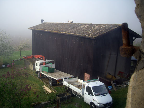 Ci-dessous notre séchoir à tabac 6X25m qui dispose à lui tout seul d’une couverture typique mais qu’il faut malheureusement entretenir. Les fuites avaient fait leur apparition et risquaient à terme de compromettre le bâtiment ... il était temps d’agir. Nous avions donc signé à l’automne dernier un devis qui nous engageait pour ce printemps.